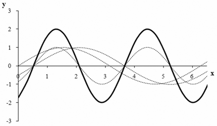 При этом, поскольку базовая функция y = sin x — периодическая с основным периодом 2π, то все построения мы проводили на отрезке оси 0х длиной 2π: [2π]. Полученный график нетрудно продолжить на всей области определения.Пример 13.Построить график функции